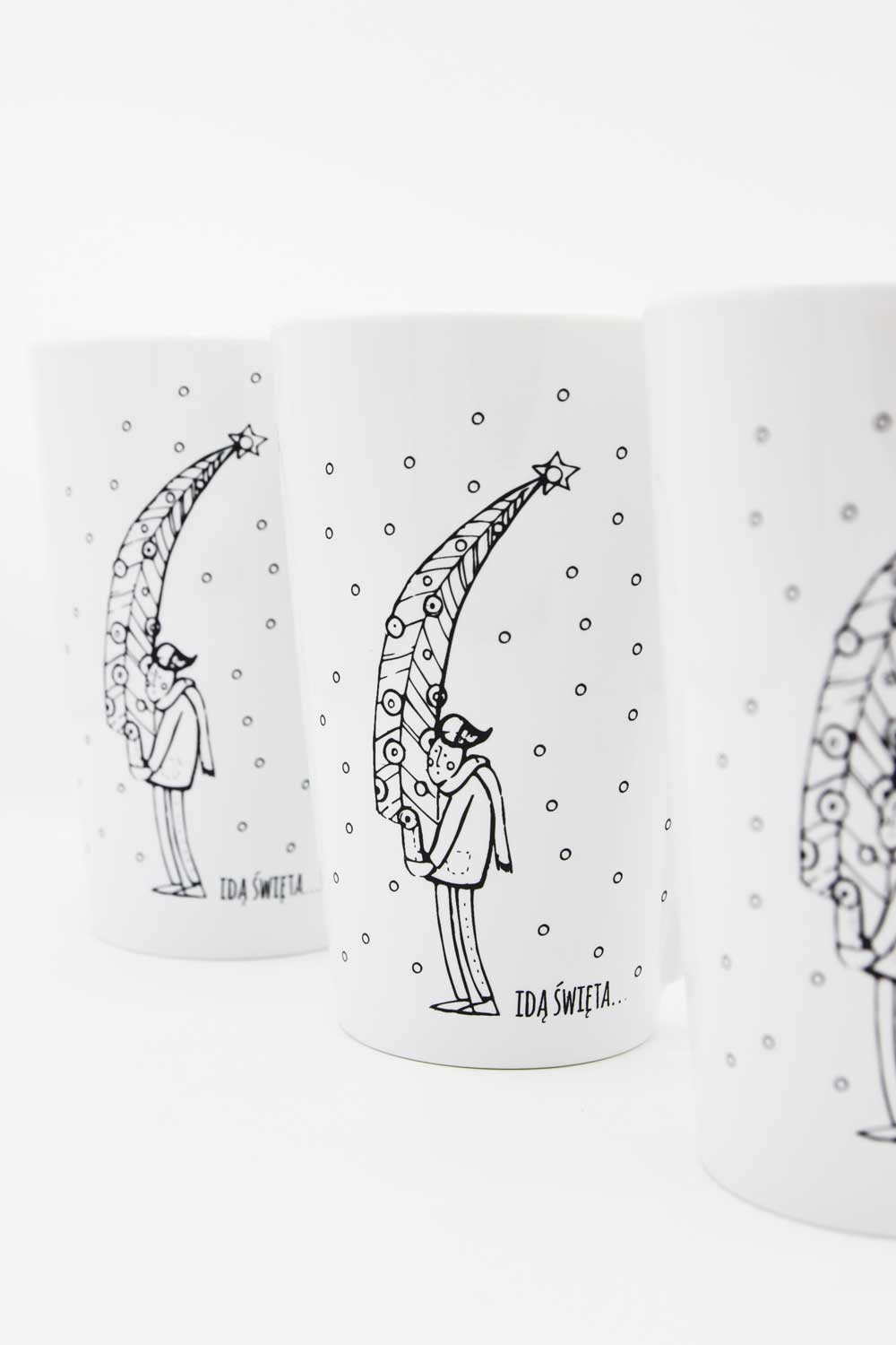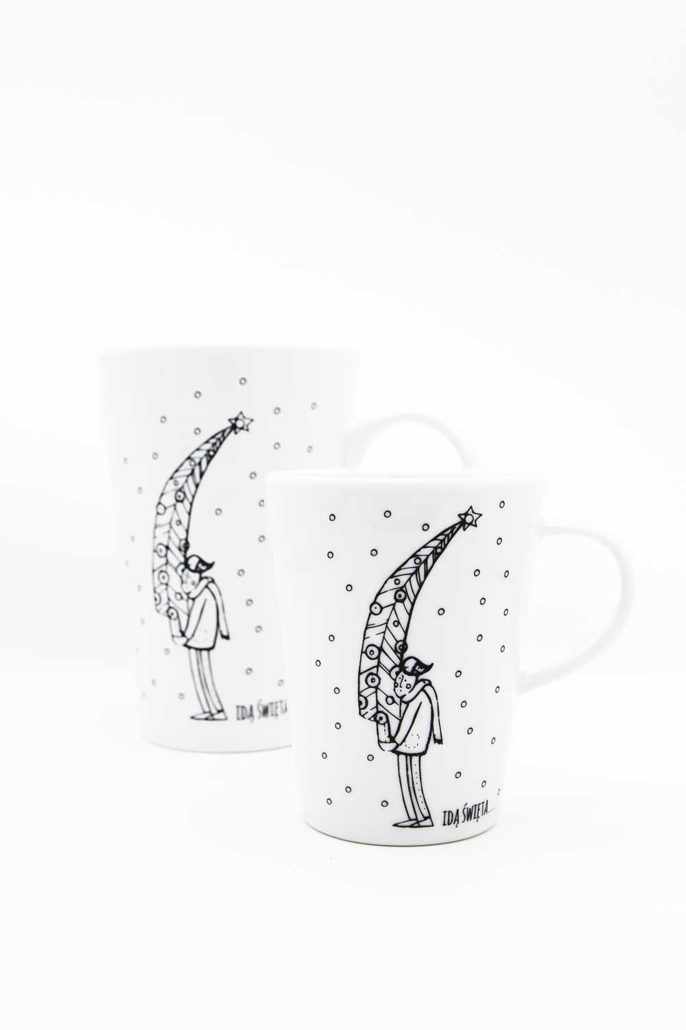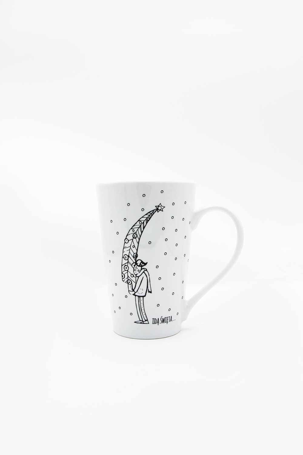 Uroczy kubek porcelanowy z zimowym i świątecznym motywem – przedstawiający ludzika trzymającego choinkę wraz z napisem „Idą Święta”. Dekoracja wykonana jest trwałą kalką ceramiczną, dzięki czemu detale są wyraźne, a zdobienie odporne na codzienne użytkowanie.