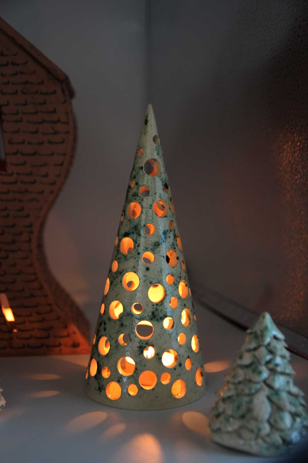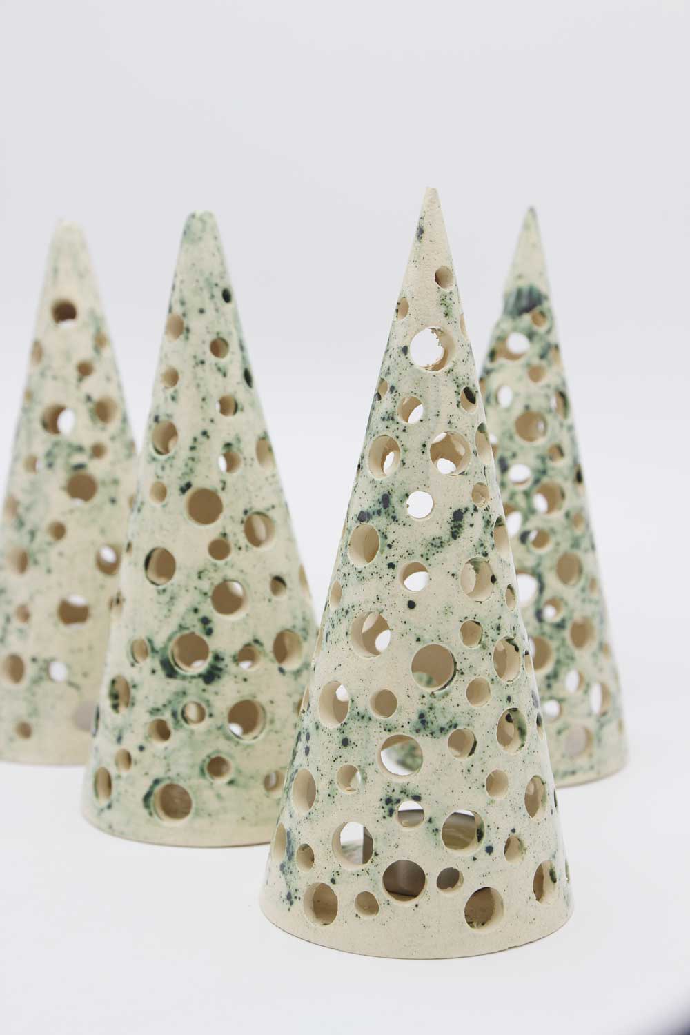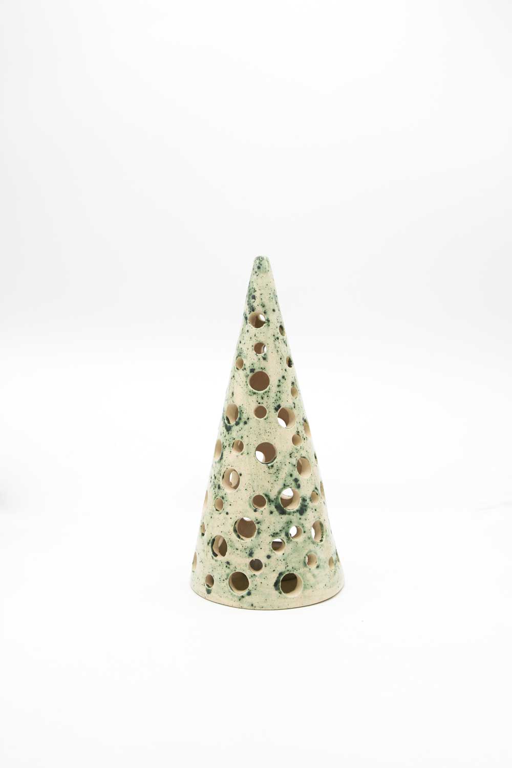 Stożkowata forma choinki została szkliwiona natryskowo w odcieniu butelkowej zieleni z delikatnymi przejściami w kolor kremowy, co nadaje jej lekkości i elegancji. Liczne otwory w ceramice pozwalają, by po włożeniu do środka świeczki typu tealight, światło tworzyło na ścianach magiczne refleksy i ciepłe punkty blasku.