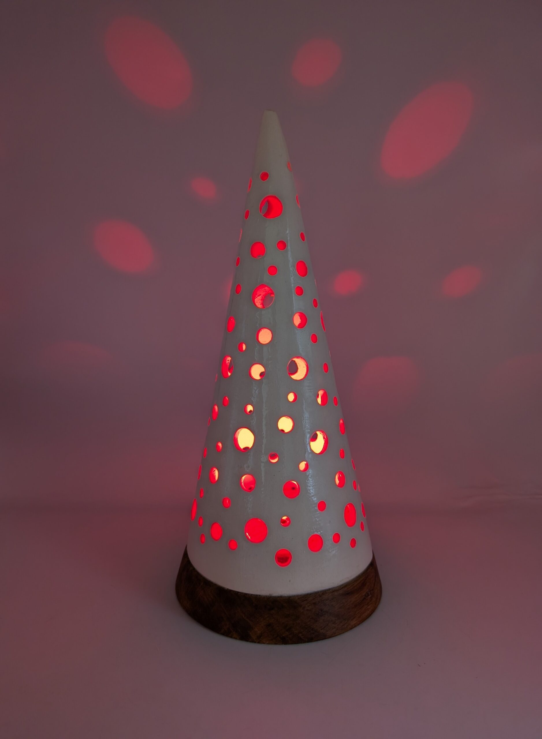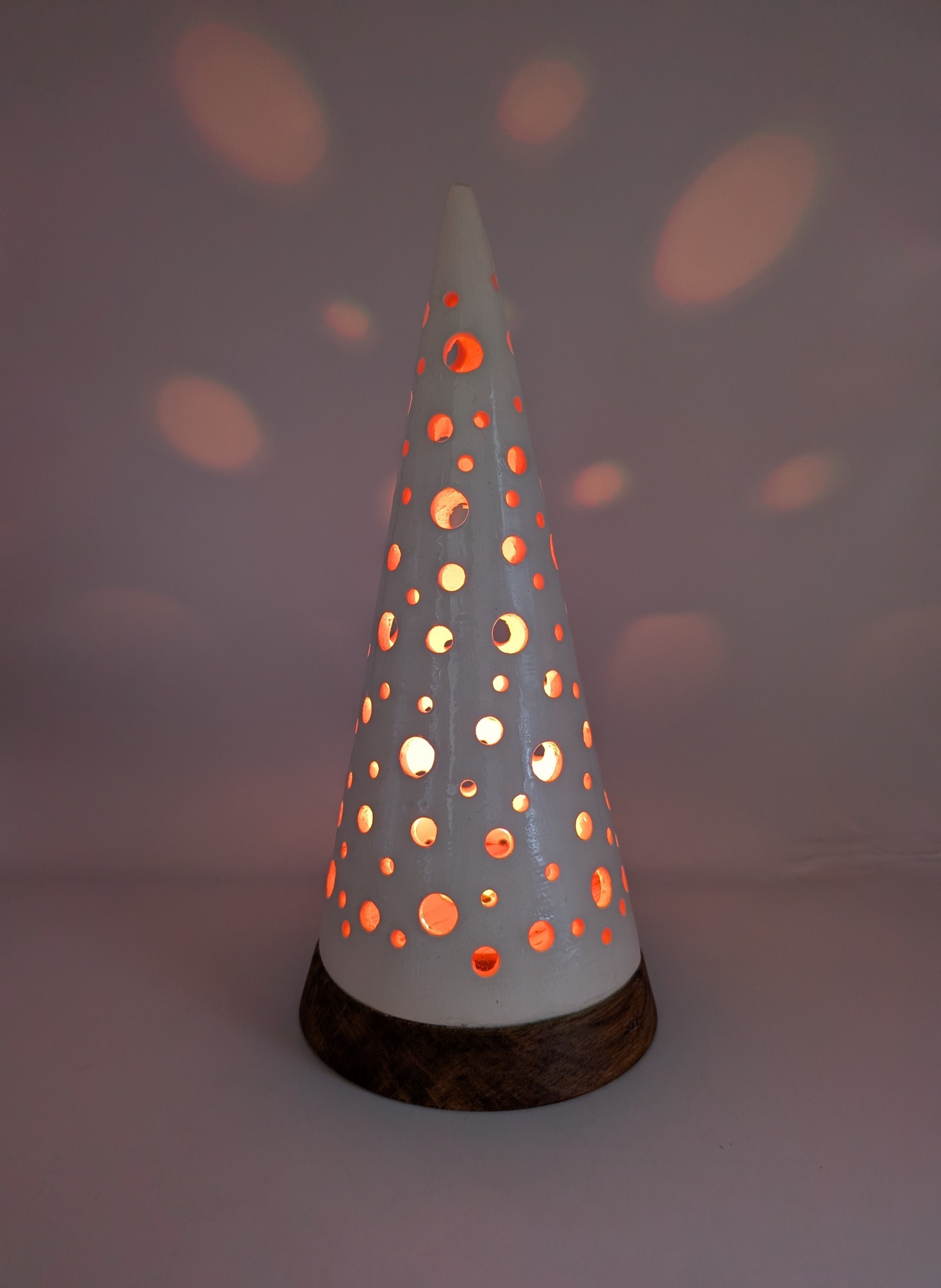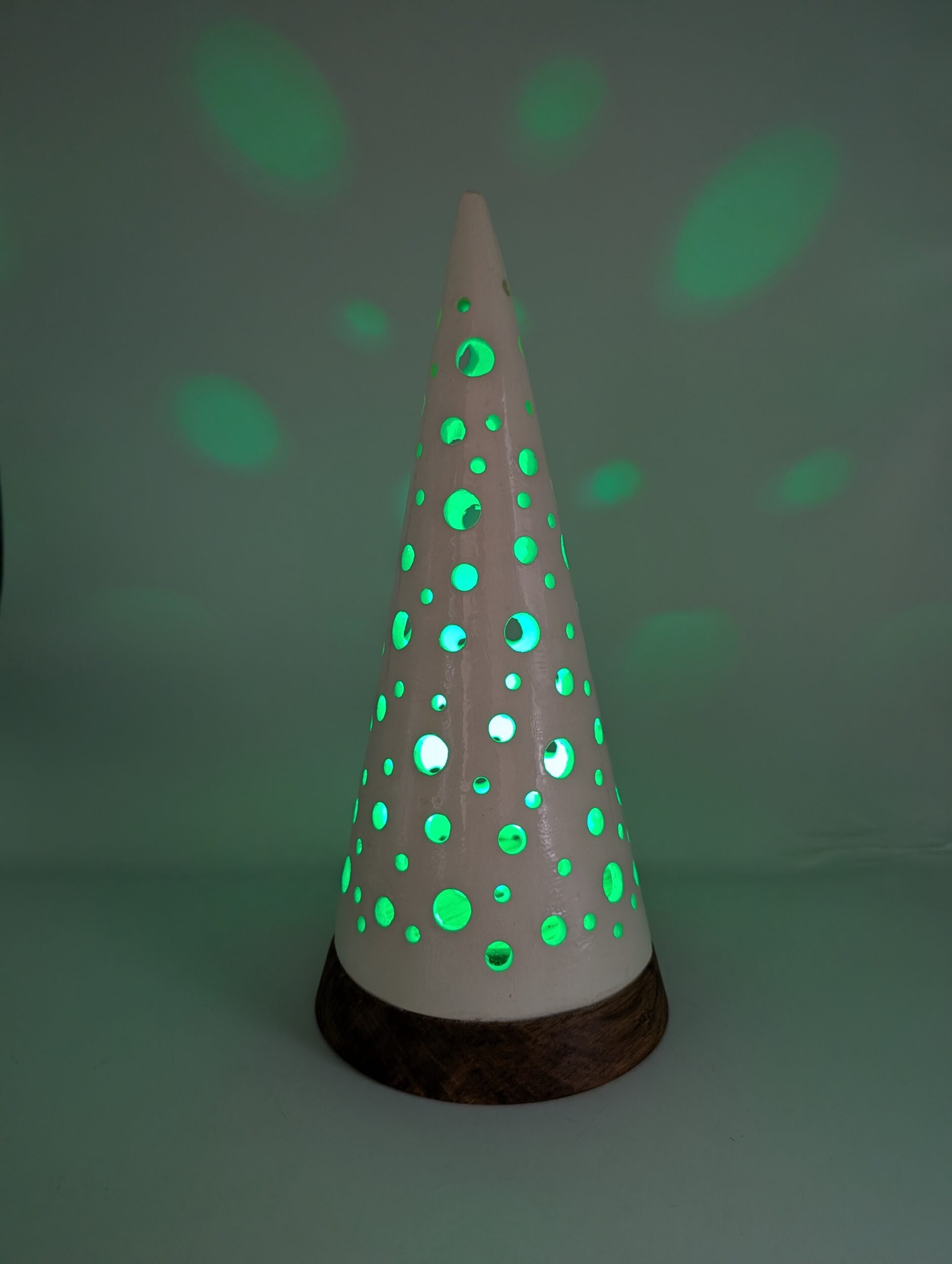 Lampion ceramiczny na dębowej podstawie – stożkowy, kremowy, z mechanizmem LED RGB – unikat