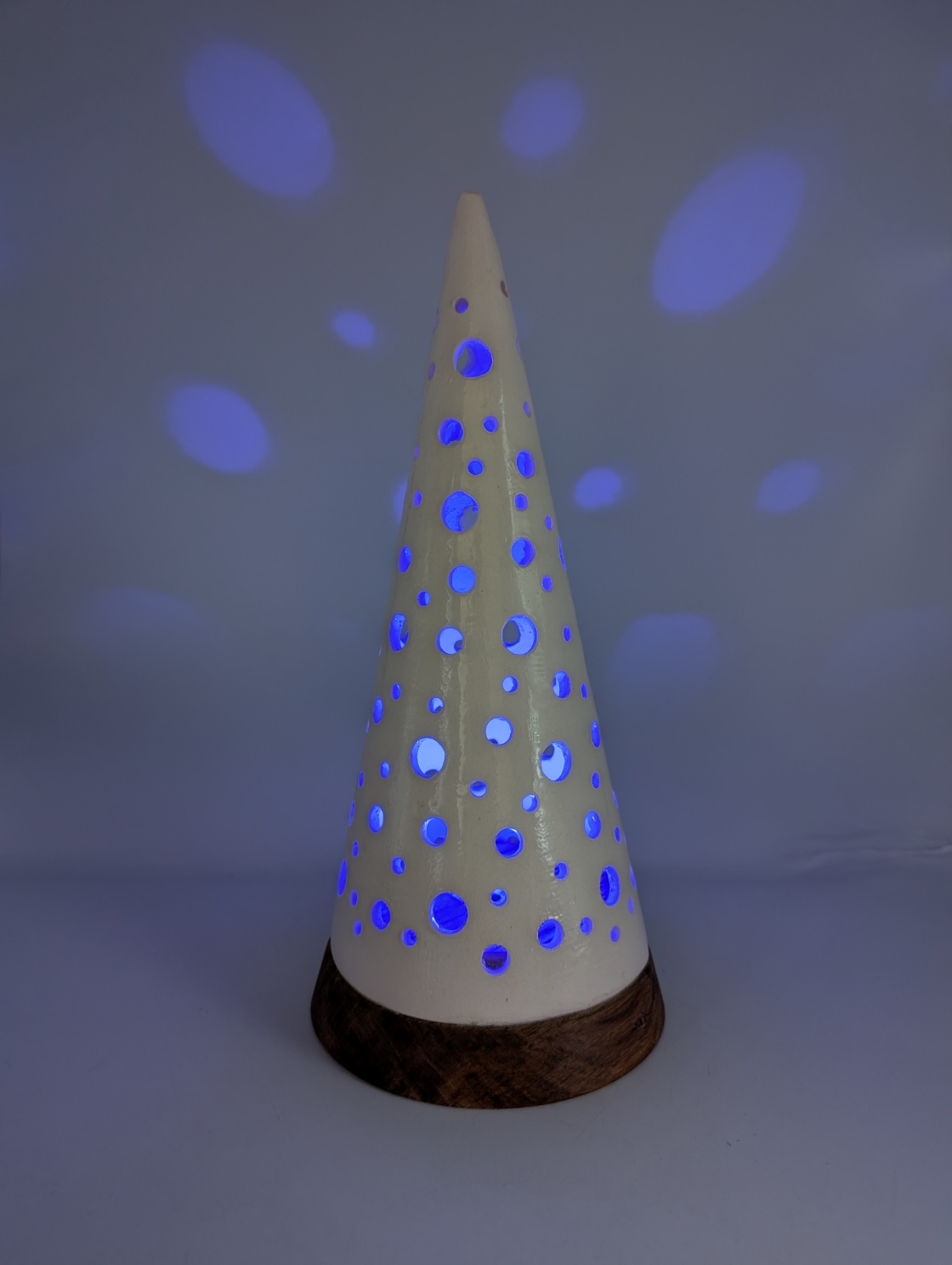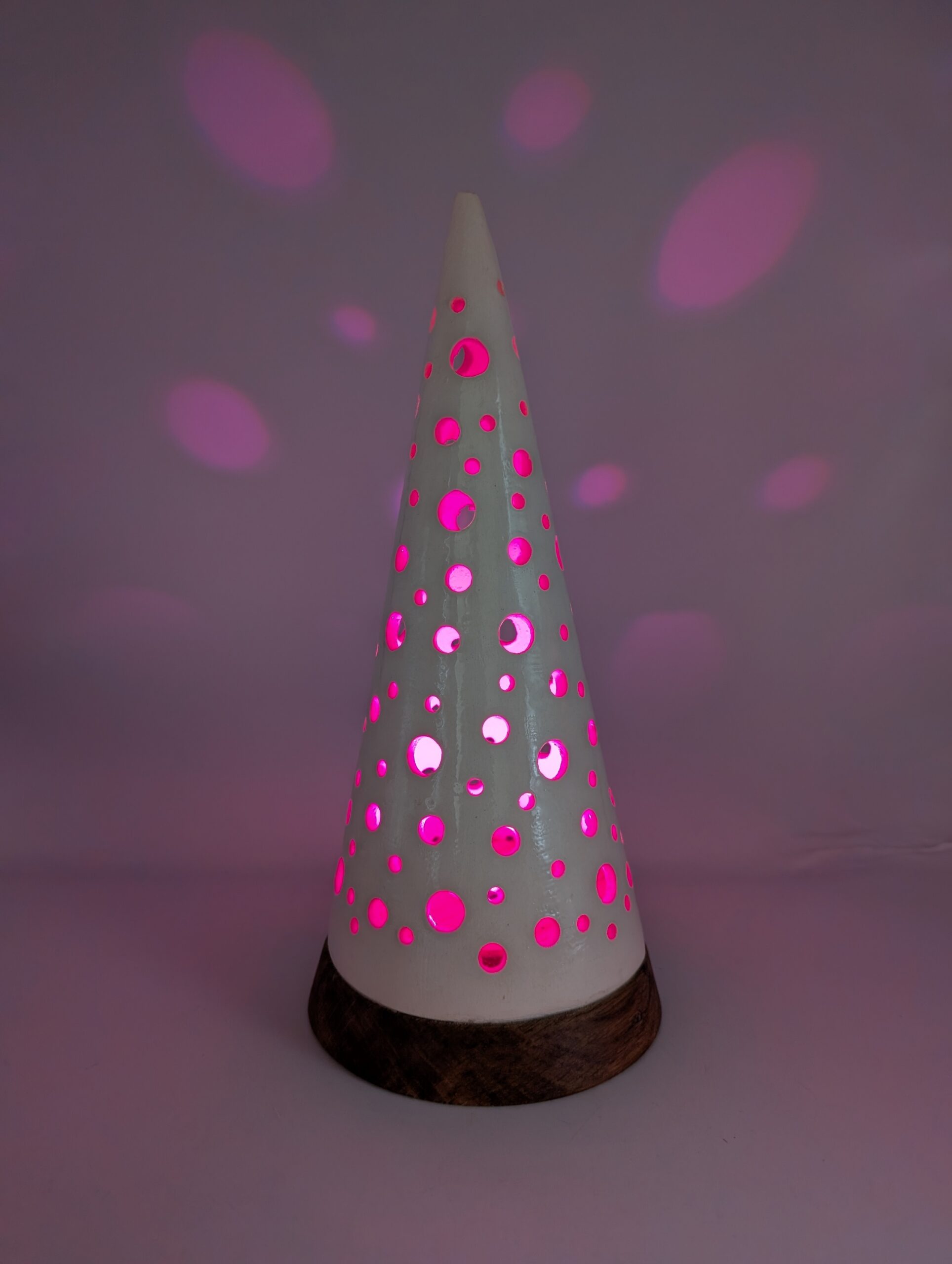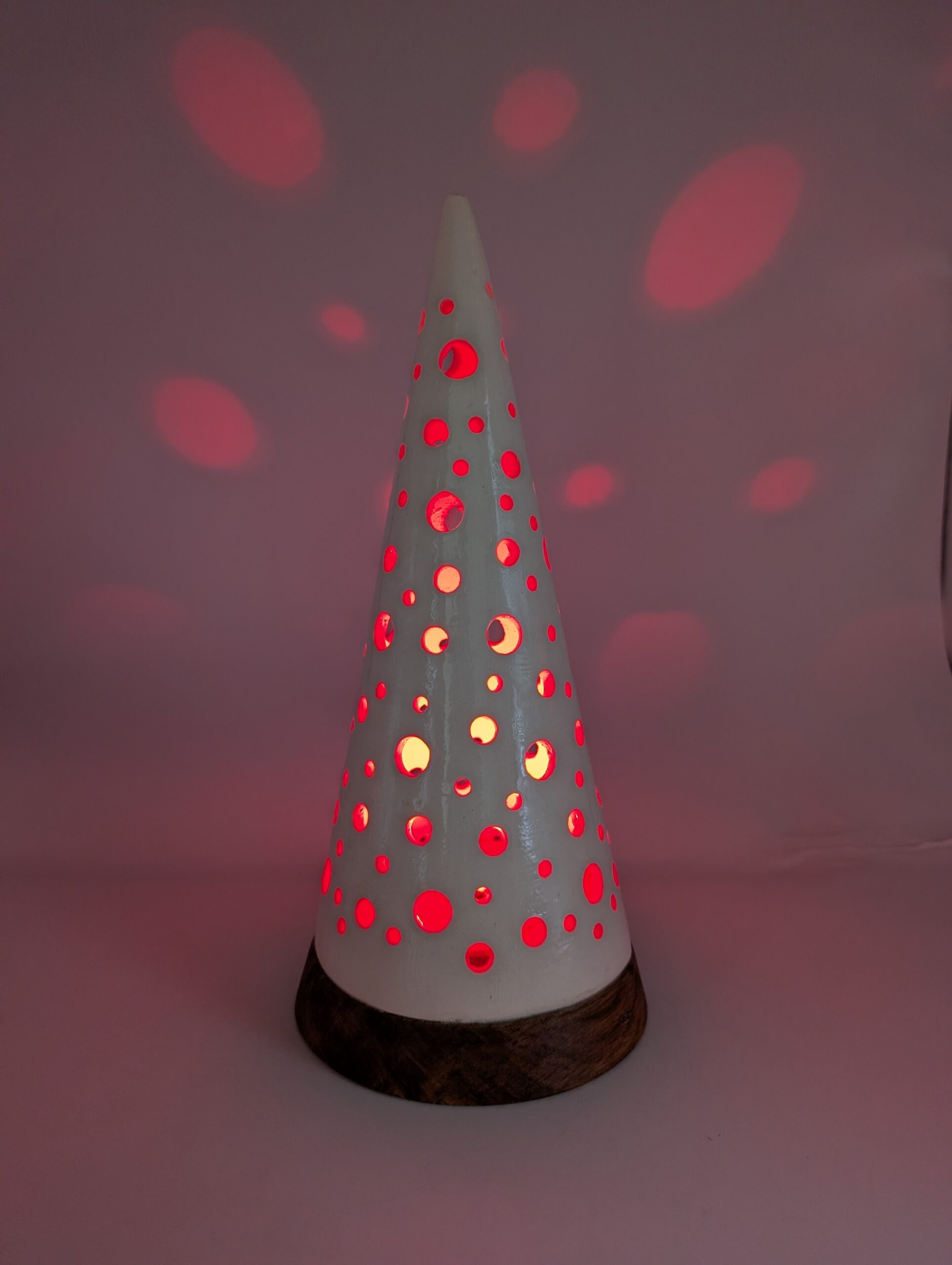 Lampion ceramiczny na dębowej podstawie – stożkowy, kremowy, z mechanizmem LED RGB – unikat