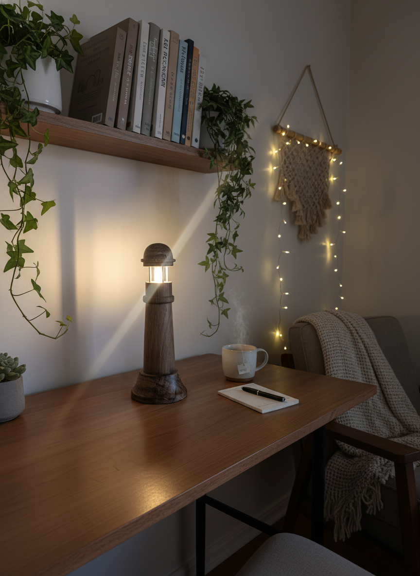 Lampion wyposażony jest w subtelne detale z metalu, a wewnątrz umieszczona została żarówka LED o ciepłej barwie światła, która tworzy nastrojowe, miękkie refleksy świetlne prześwitujące przez konstrukcję. Efekt przypomina blask prawdziwej nadmorskiej latarni, wprowadzając do wnętrza wyjątkowy klimat.
