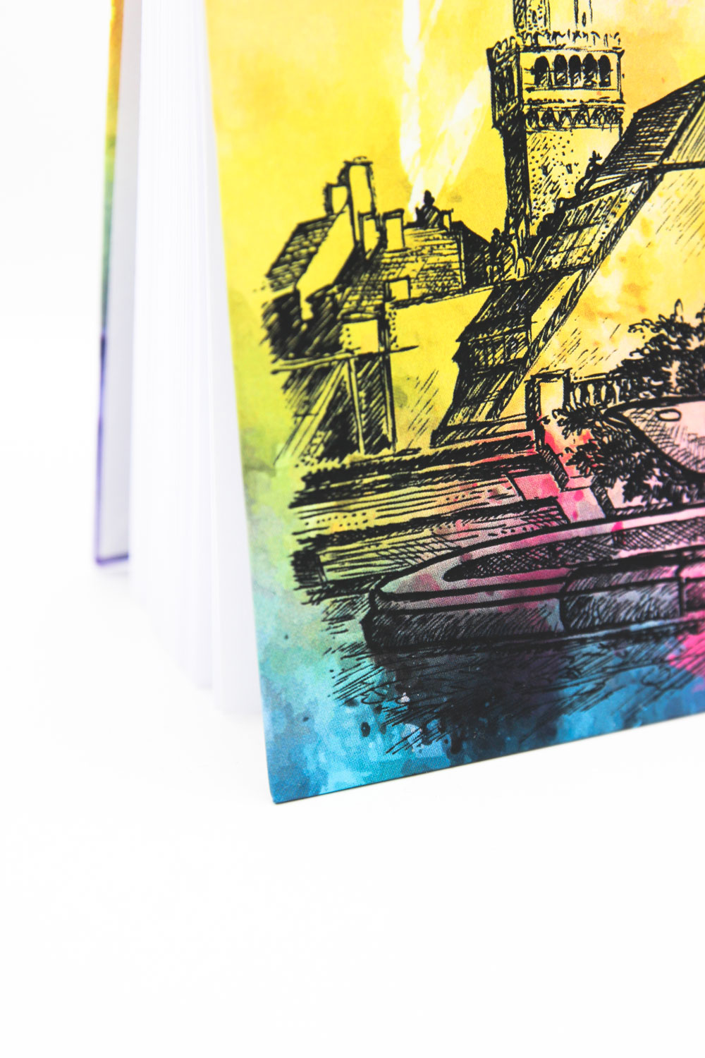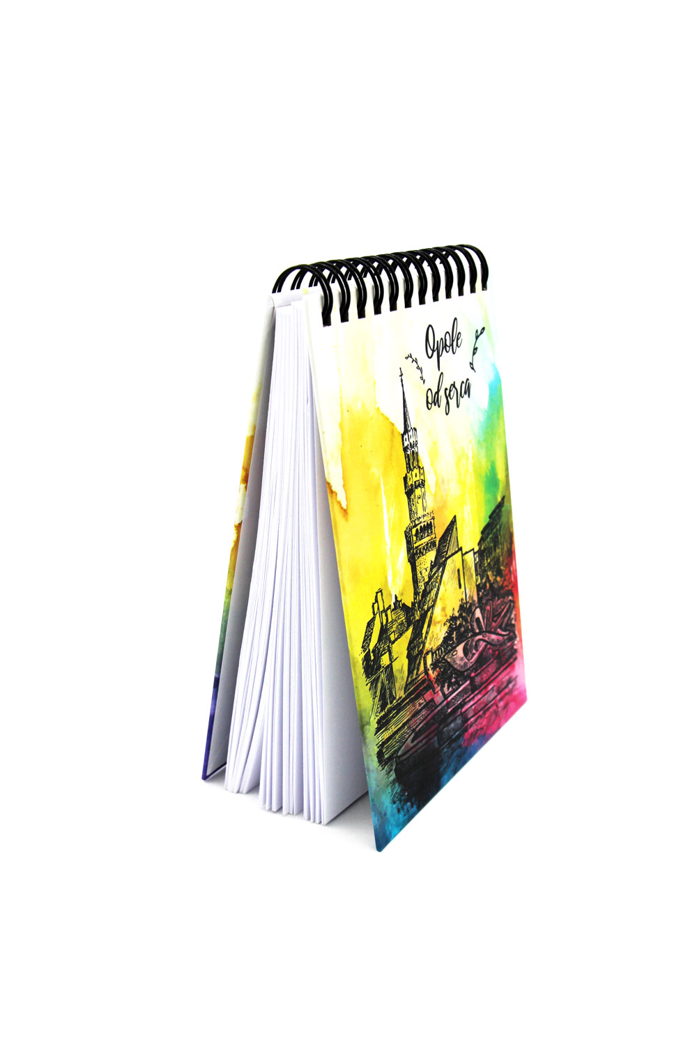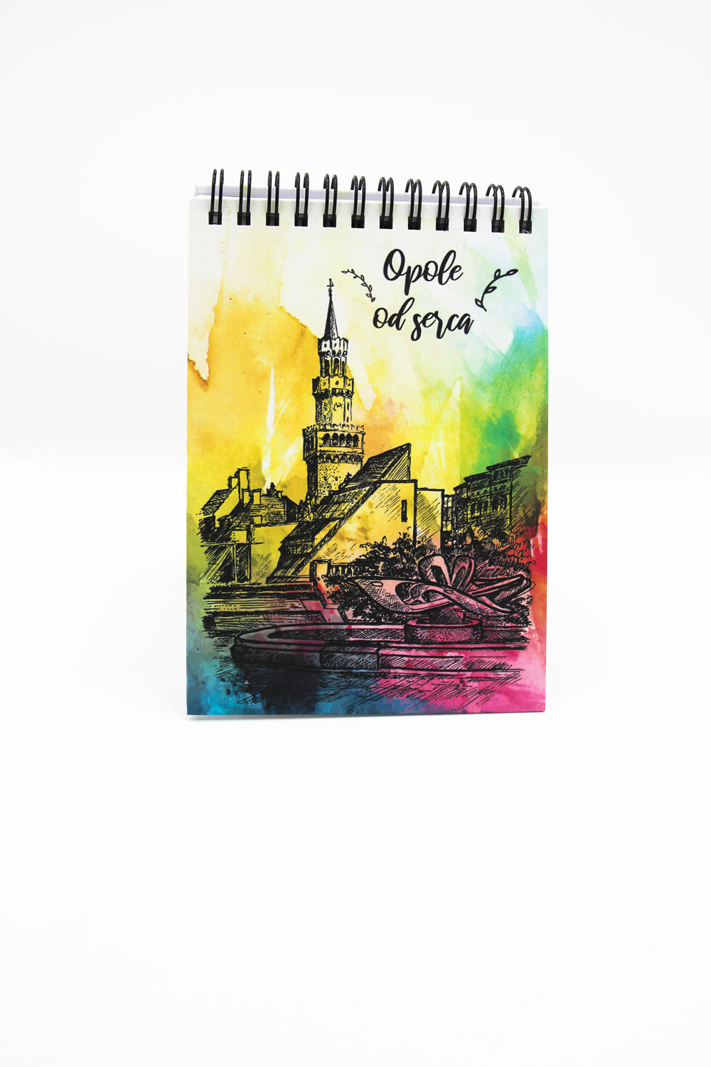 Graficzny wzór z uroczym motywem Ratusza w Opolu w pięknych pastelowych barwach. Format A6, kartki czyste. Twarda okładka, notes pionowy na kole.