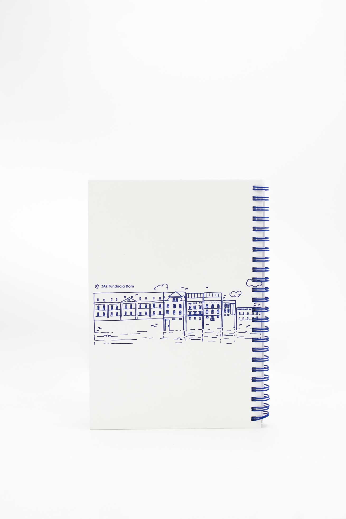 Format A5, kartki gładkie białe. Twarda okładka – biały karton Sumo o grubości 1 mm. Notes na granatowej sprężynie.